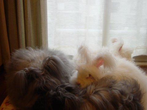 アンゴラ女子4うさ、いっぺんにお散歩タイム。 まりもちゃん、わたしのおしり見てる。(笑) へんなカッコしててわるかったわね!(笑) |