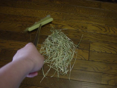ちらかりまくってる牧草をかるーく掃除。 ケージの中に牧草いれてるのに、 なんで牧草があちこちに落ちてるんでしょ。 ●も飛んでます。 |