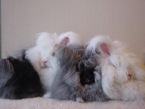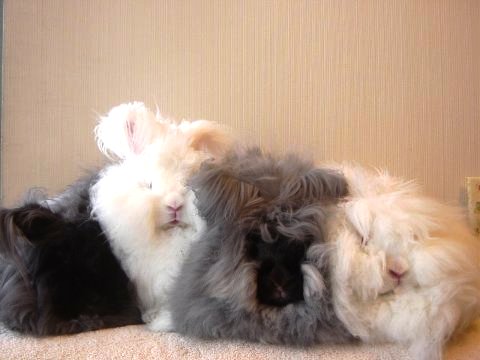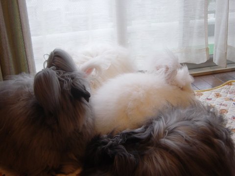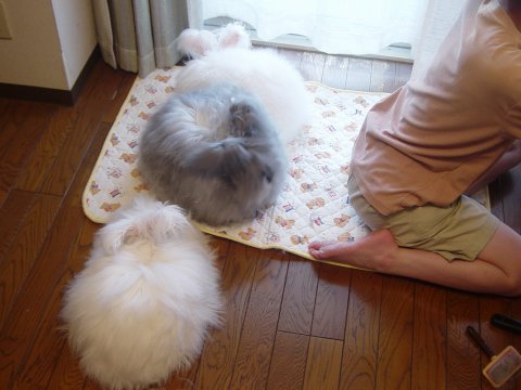 アンゴラ女子4うさ、いっぺんにお散歩タイム。 まりもちゃん、わたしのおしり見てる。(笑) へんなカッコしててわるかったわね!(笑) |