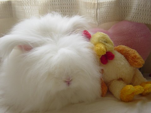にわとりさんもべったり♪ どちらがぬいぐるみなんだか。 |