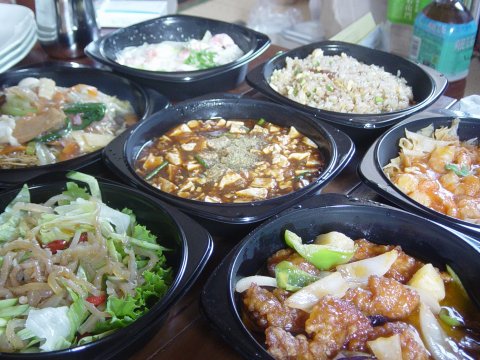 ファミレスの宅配〜 ひろこさんがつくってきてくれたえびせんべいとエビチリがあう!! |