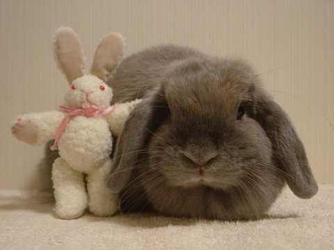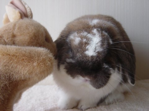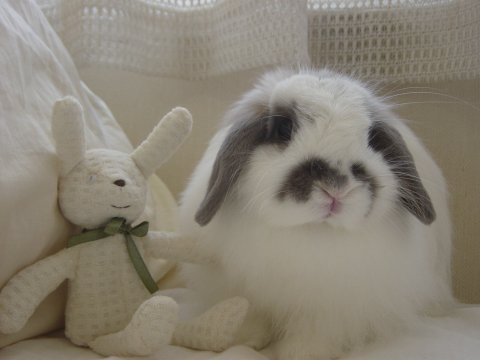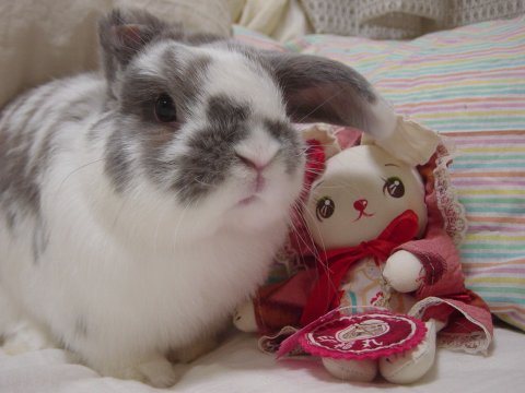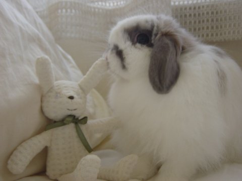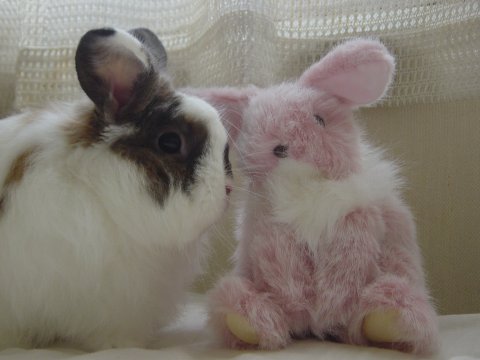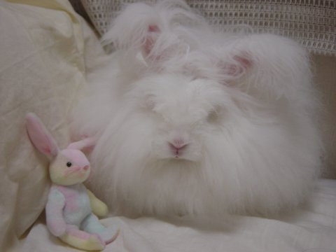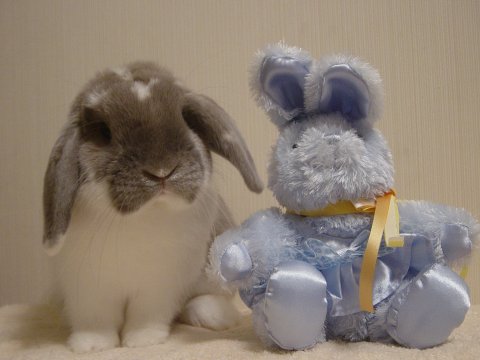 ブルーのふわふわうさぎちゃん。 黄色いリボンはわたしがなんとなくつけてみたんだけど、ないほうがすっきりしてかわいいわね・・・・^^; エスコートはぶさいくな顔の半平太でした♪ |