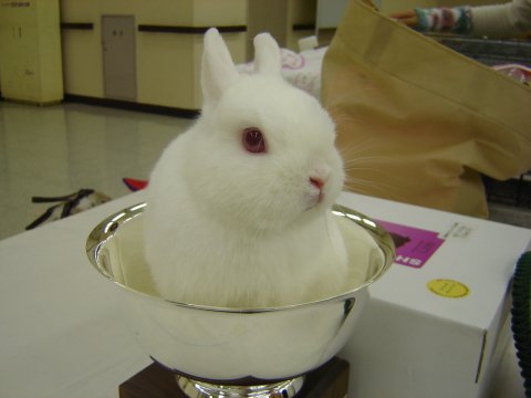 マジメに取り組んでたのかしら、ボケ之進は。 実は実は、半年前のARBAscのショーのときも このクサ之進、エントリーしてたのですがー。ですがー。 ですがー。 DQ(失格)だったのです。(恥) その理由っていうのがまた・・ 緊張のあまり、鼻をたらしたから・・・・。 ( ̄◇ ̄; うちでいるときは誰よりも態度でかく、うほうほ言いながら走り回るうさぎなのに プレッシャーに弱いらしい。 今回は、レメディを使用し落ち着かせてあったので鼻垂らしDQはないにしても 毛が汚い&白髪多し(苦労してないのに)でDQだと思っていました。 |