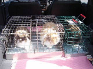 またまたいってきま〜す。 移動は、キャリーで。 広いケージで移動すると万が一暴れた場合危険です。 車の中は温度があがりますので、暑さも注意してくださいね。 |