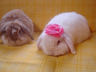 そして〜 イングリッシュアンゴラは 「たからといぶき」の『たから』(黒)と、「さちふく」の『ふく』(白)です。 いつもと違うペア、シャッフルユニットですね^^ この子ら特にふくちゃんは、ショーに出れるだけで満足。 さちも連れてきたかったけど、おなかの古傷がびろろ〜〜〜んってなってるからね(笑) |